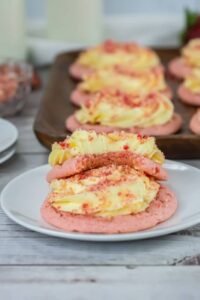 Crumbl sugar cookies are thick, soft sugar cookies topped with a creamy pink almond-flavored frosting and typically served chilled. They’re known for their bakery-style size, tender centers, and signature smooth frosting swirl. This homemade version recreates that same soft texture and rich flavor using simple pantry ingredients in under 30 minutes.