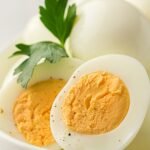 Close-up of sliced hard-boiled eggs with firm white and bright yellow yolks, lightly seasoned and ready to serve.